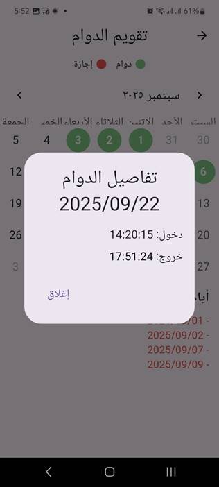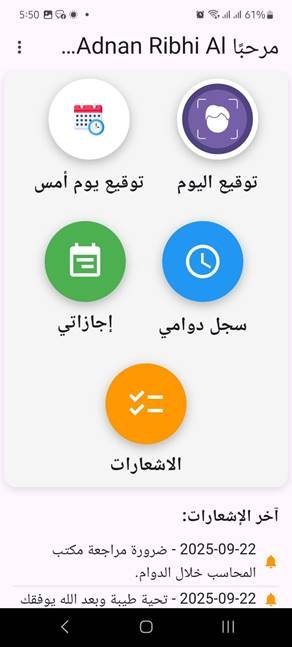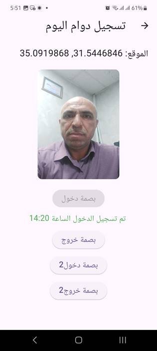 الدوام مع حفظ الموقع الجغرافي وصورة شخصية.